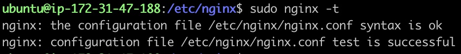 잘 적용되었는지 확인을 위해 nginx를 종료 후 다시 동작시키기보다는 'nginx -t'을 사용해서 검증을 진행한다.
