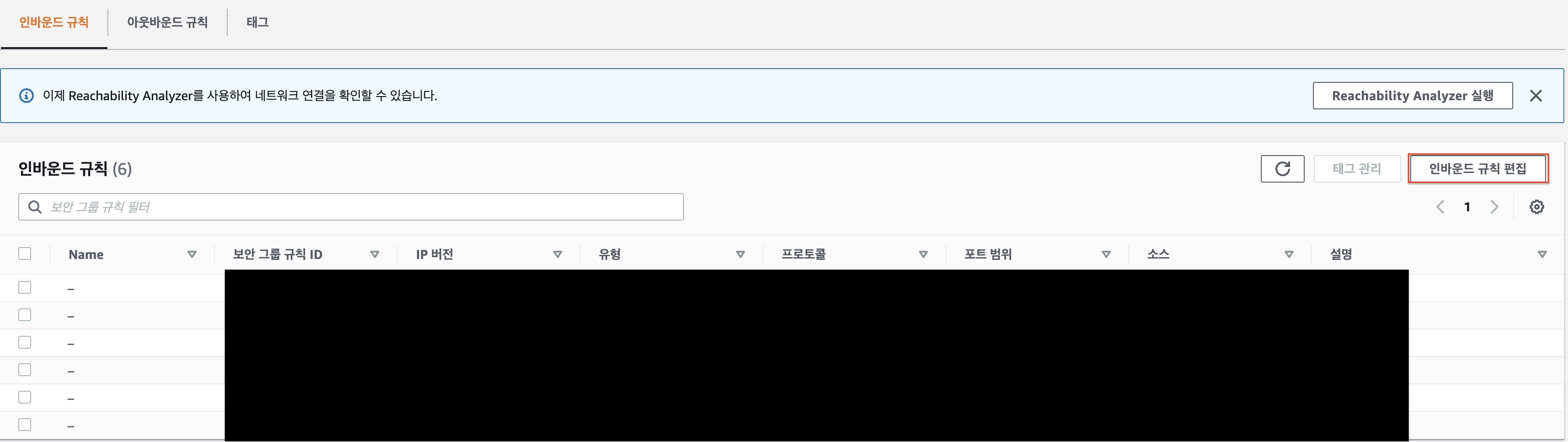 aws console -> ec2 서비스 -> 수정할 인스턴스(인스턴스 ID) -> 보안 -> 보안 그룹 -> 인바운드 규칙 편집